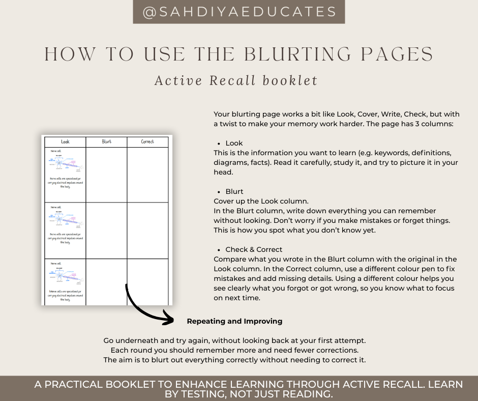 This booklet is designed to help you move away from revising by just reading. By testing yourself, recalling information, and correcting mistakes, you strengthen your memory and build a deeper understanding of microscopy. With tools like summary pages, blurting exercises, the Feynman technique, and timed revision, it gives you the chance to practise active recall — helping you learn smarter and remember more.