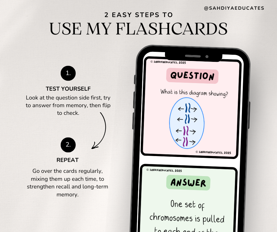 🔑 Tip: Don’t just read these flashcards—test yourself repeatedly for the best results. Pair them with my guide on “How to Use Flashcards” for an effective study method.