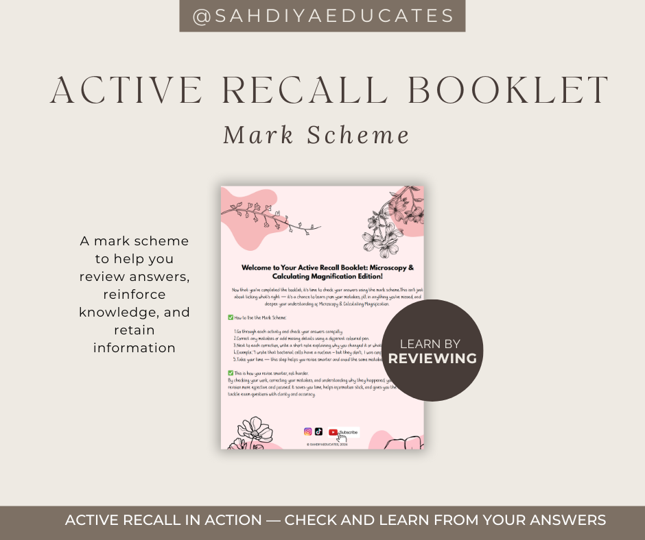 This mark scheme is designed to help you move beyond revising by just reading. By checking and correcting your answers, you can strengthen your memory and truly understand the material. It works best when paired with my Active Recall booklet and Notes: Microscopy & Calculating Magnification, guiding you to practice active recall effectively, helping you remember more, learn smarter, and feel fully prepared for exams.